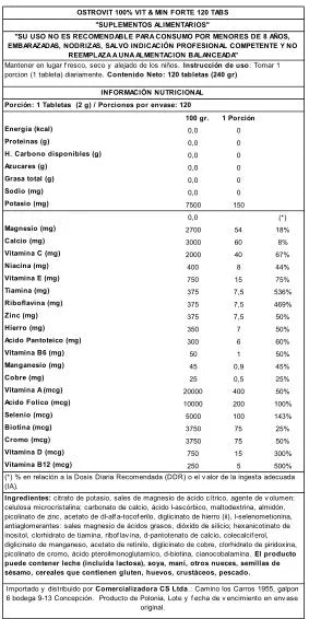 La composición del suplemento se seleccionó de tal manera que las vitaminas y minerales que contiene afectaran a casi todos los procesos bioquímicos que ocurren en el cuerpo humano. Su suplementación y suministro adecuado es necesario para mantener una adecuada forma física y mental, el bienestar y el equilibrio del organismo. Una sola dosis del preparado cubre por completo la necesidad diaria de las vitaminas y minerales del cuerpo humano adulto y repone eficazmente cualquier deficiencia resultante del aumento de la actividad física o de una dieta incorrectamente equilibrada. Propiedades de los ingredientes contenidos en OstroVit Vit&Min FORTE: Enorme potencial antioxidante Necesario para llevar a cabo los principales procesos bioquímicos. Actúa como un escudo protector natural: la resistencia del cuerpo. Huesos sanos y fuertes Mejor humor Ayuda en la lucha contra resfriados e infecciones.